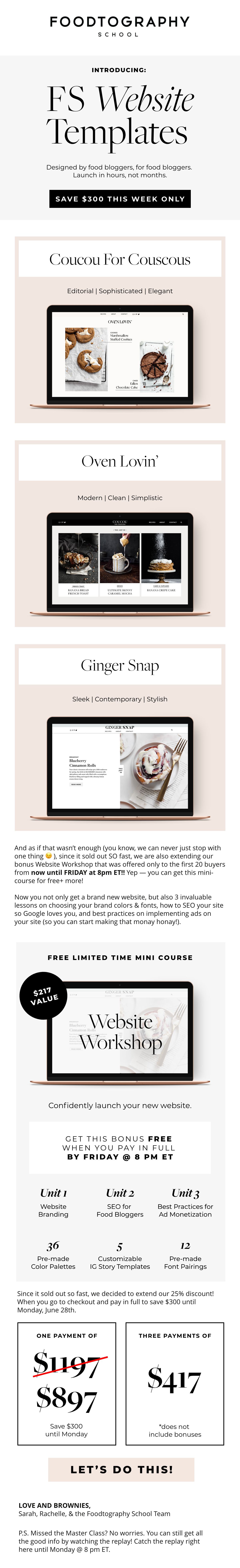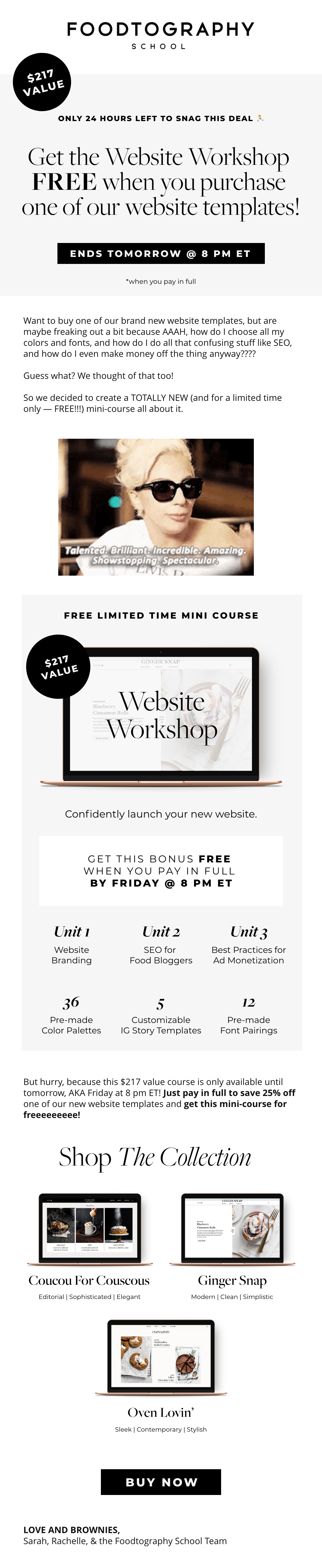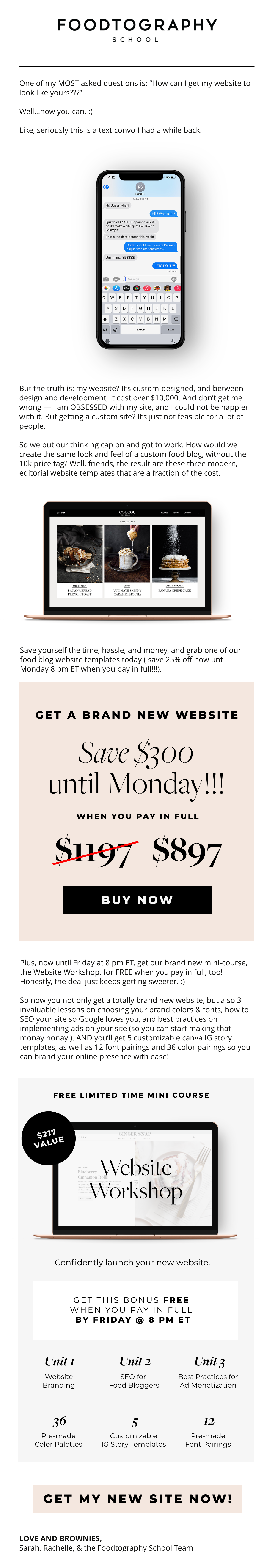 My client, Foodtography School, developed a series of website templates made by food bloggers, for food bloggers. In this email sequence, we promoted the launch, highlighting how easy it is to set up the templates, and the Website Workshop bonus course they’d get if they purchased during the sale.
